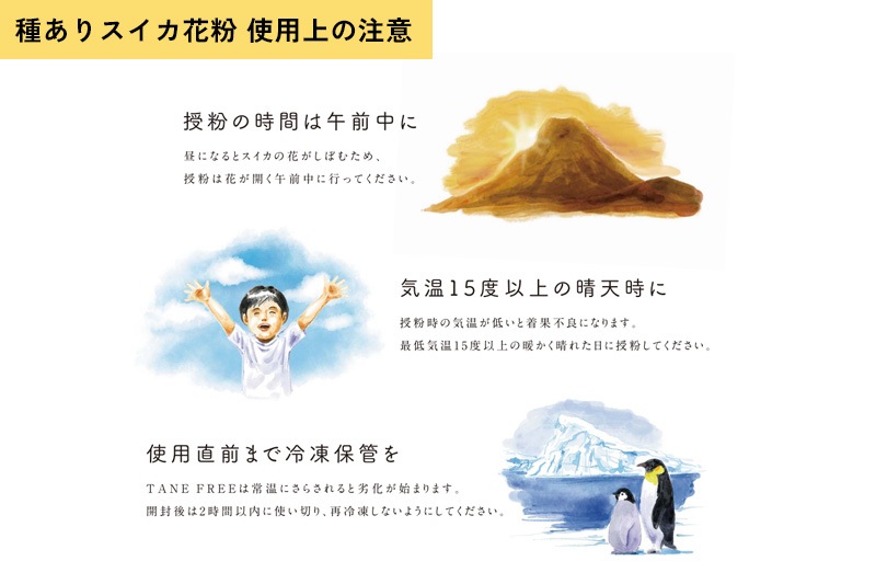 ※シードレススイカ(種なし品種)の授粉用には、交配用スイカ花粉をご使用ください。